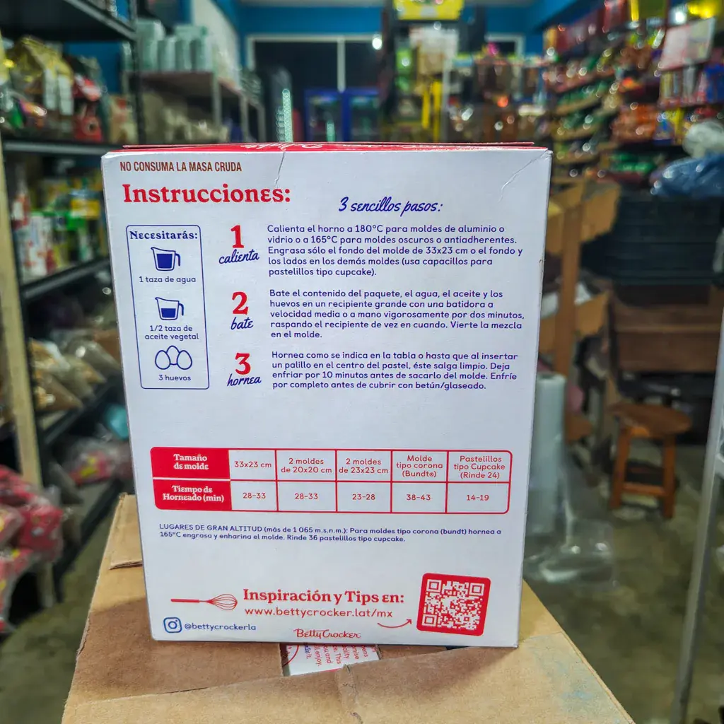 El gusto de crear con Betty Crocker. Hornear nunca había sido tan fácil, prepara un esponjoso, elegante y delicioso pastel de chocolate estilo Red Velvet en solo tres pasos con la harina Betty Crocker. - Solo necesitarás tres ingredientes: Agua, aceite vegetal y huevo. - Las instrucciones vienen al reverso de la caja. Diviértete en la cocina creando tus postres favoritos.