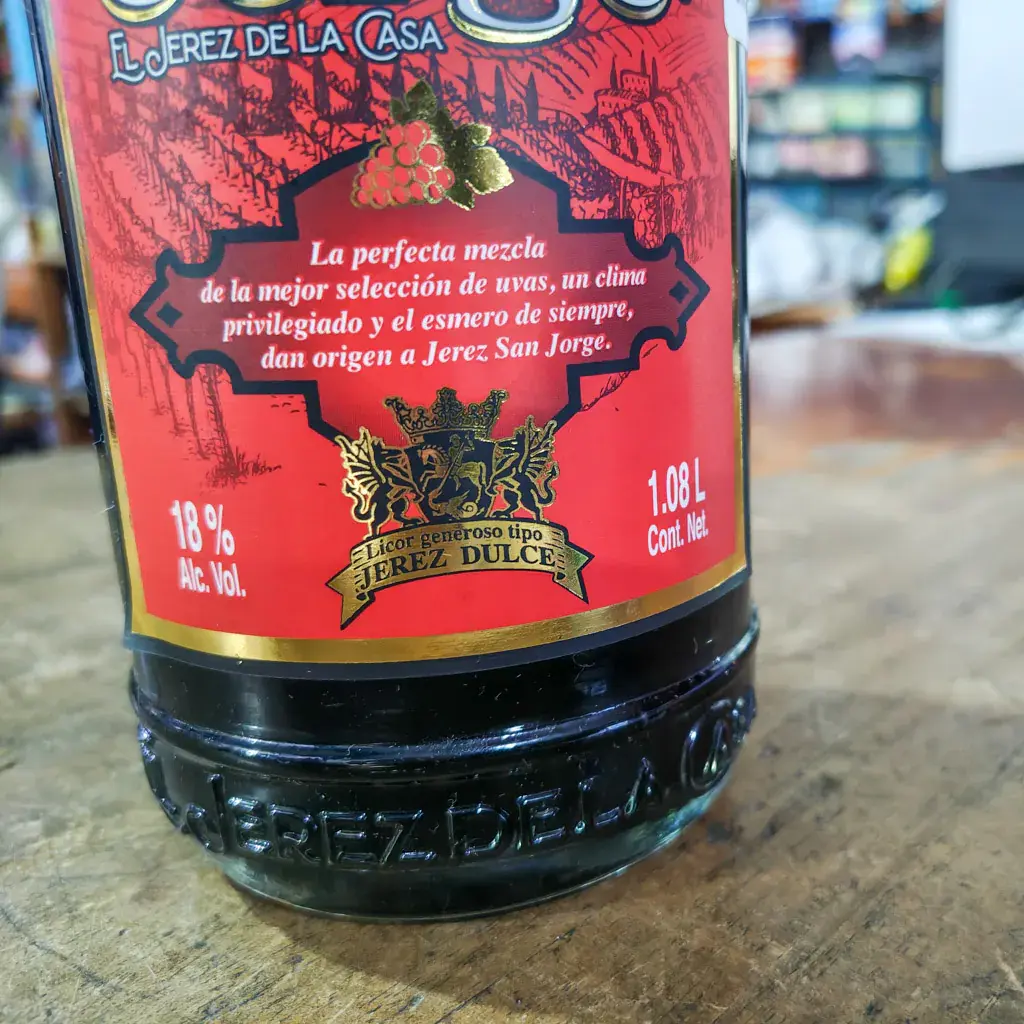 El Jerez Dulce San Jorge es un vino generoso, conocido por su sabor dulce y su complejidad, tiene un color oscuro, casi ambarino, con reflejos caoba. En nariz, destaca por su intensidad, con aromas de frutas pasas, higos, dátiles y un toque de miel, junto con notas de frutos secos y un ligero matiz de madera debido al envejecimiento en barricas de roble.